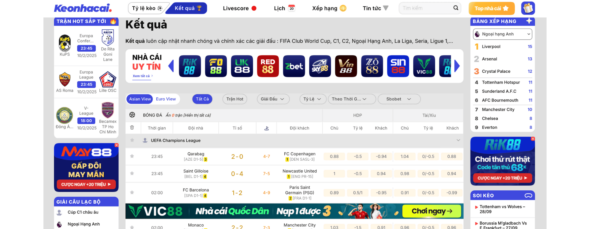 Kết quả bóng đá hôm nay trên tylekeo.sh