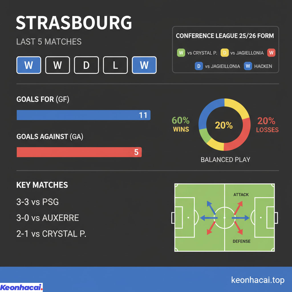 Trái ngược với đối thủ, Strasbourg lại thể hiện một phong độ tương đối ổn định hơn, đặc biệt là ở đấu trường châu Âu. Mặc dù có những trận thua ở giải VĐQG Pháp (Ligue 1), nhưng họ vẫn biết cách giành điểm tại Conference League.