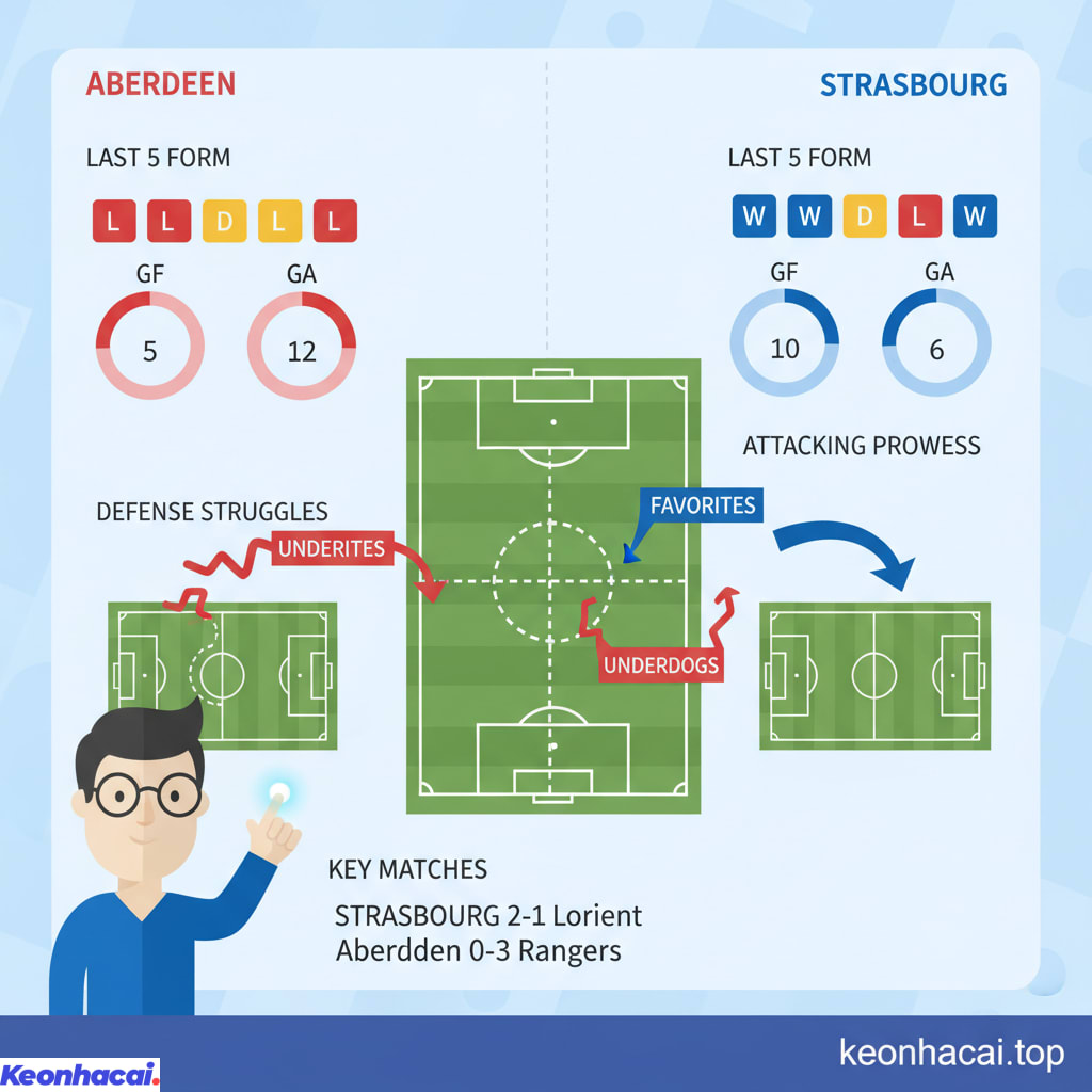 Tổng hợp từ các phân tích phong độ và kèo cược, Strasbourg là đội được đánh giá cao hơn hẳn. Họ sở hữu hàng công hiệu quả và một lối chơi tự tin tại đấu trường châu Âu. Trong khi đó, Aberdeen đang thể hiện nhiều bất ổn, đặc biệt là ở khâu phòng ngự. Việc thi đấu trên sân nhà có thể mang lại chút lợi thế tinh thần, nhưng khó lòng bù đắp được khoảng cách về chuyên môn.