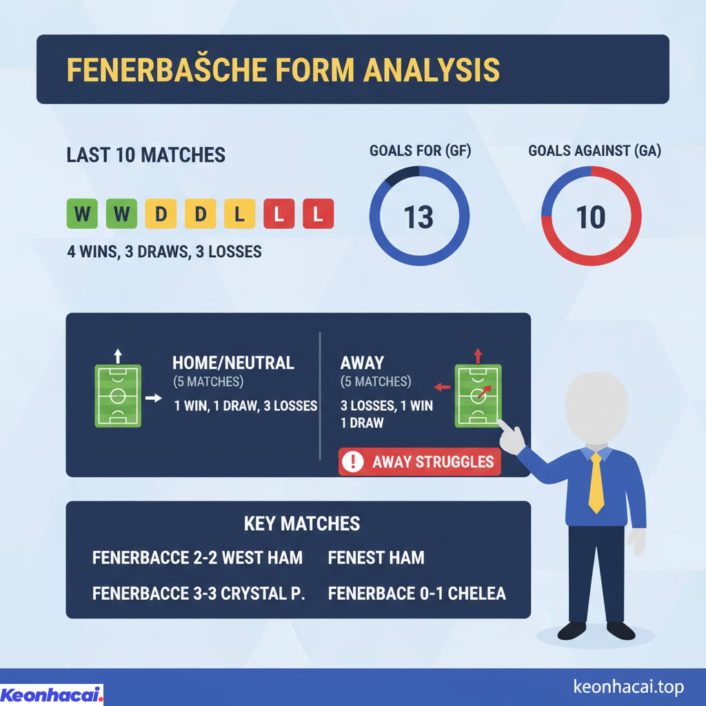 Trong 10 trận gần đây, Fenerbahce có 4 chiến thắng, 3 trận hòa và để thua 3 trận. Đội bóng này ghi được 13 bàn và để thủng lưới 10 bàn. Hàng công của Fenerbahce hoạt động tương đối hiệu quả, nhưng hàng thủ đôi khi vẫn còn những lỗ hổng, đặc biệt là trên sân khách. Trong 5 trận sân khách hoặc trên sân trung lập gần nhất, Fenerbahce chỉ giành được 1 chiến thắng, hòa 1 và thua tới 3. Điều này cho thấy họ thường gặp khó khăn khi phải xa nhà. Các chuyên gia cũng đang rất quan tâm đến các trận đấu khác như Soi kèo Celta Vigo vs Bologna để đánh giá cục diện vòng đấu này.