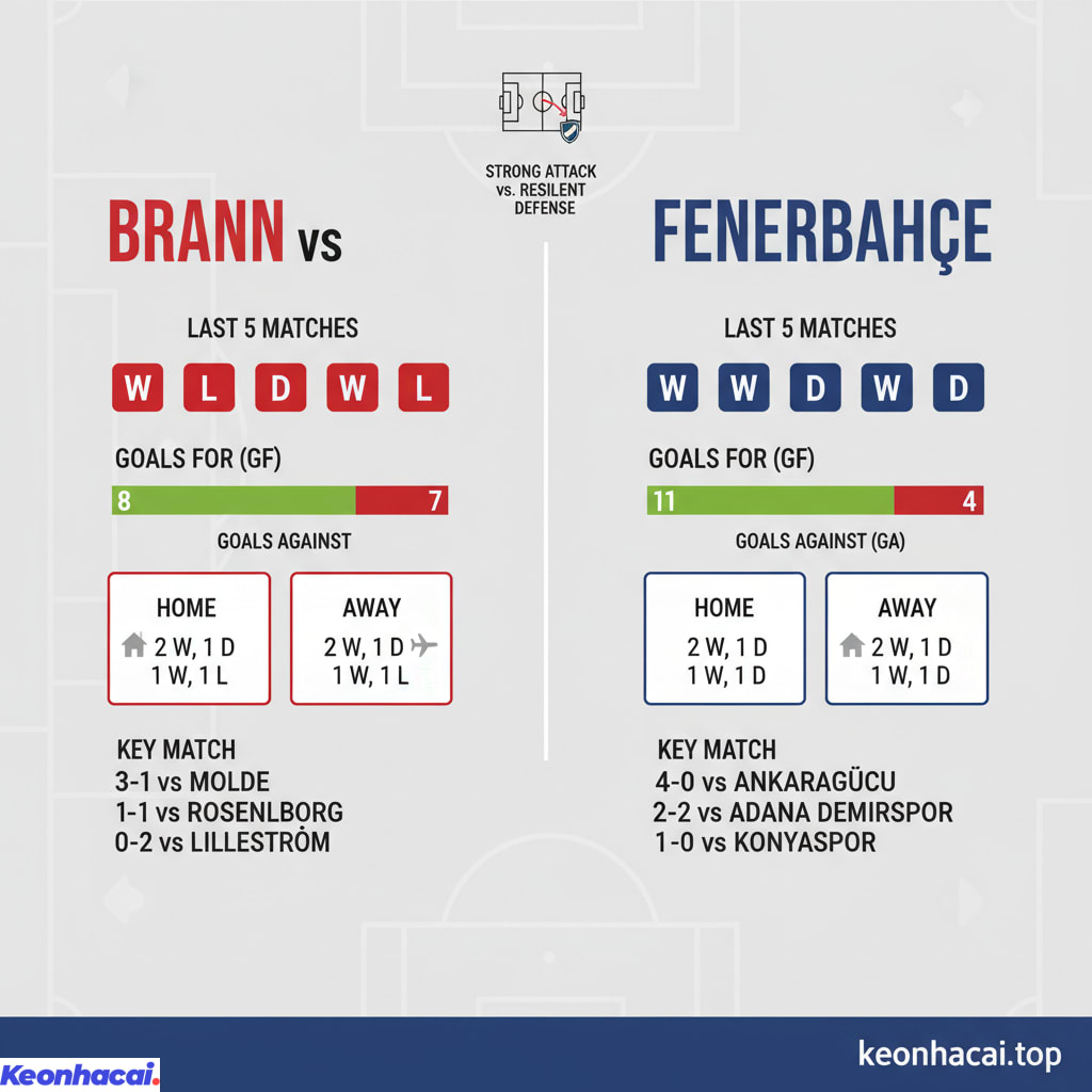 Fenerbahce có thể được đánh giá nhỉnh hơn về chất lượng đội hình tổng thể, nhưng Brann với lợi thế sân nhà và phong độ ổn định sẽ không dễ dàng chịu khuất phục. Đội bóng chủ nhà sẽ nhập cuộc với sự tự tin cao độ và lối chơi chặt chẽ để hạn chế sức mạnh tấn công của đối thủ. Khả năng cao đây sẽ là một trận đấu giằng co với thế trận cân bằng.