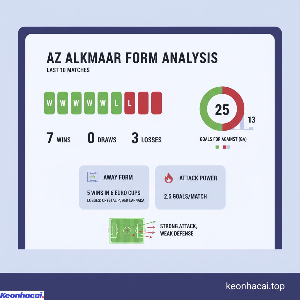 Trong 10 trận đấu gần nhất, AZ Alkmaar giành tới 7 chiến thắng, không có trận hòa nào và chỉ để thua 3 trận. Đáng chú ý, hàng công của họ cực kỳ hiệu quả với 25 bàn thắng được ghi, trung bình 2.5 bàn/trận. Tuy nhiên, hàng thủ đôi khi vẫn mắc sai lầm và đã để thủng lưới 13 bàn. Phong độ sân khách của AZ Alkmaar cũng rất tốt với 5 chiến thắng trong 6 trận gần nhất tại các cúp châu Âu, chỉ để thua Crystal Palace và AEK Larnaca là những đội được đánh giá cao hơn.
