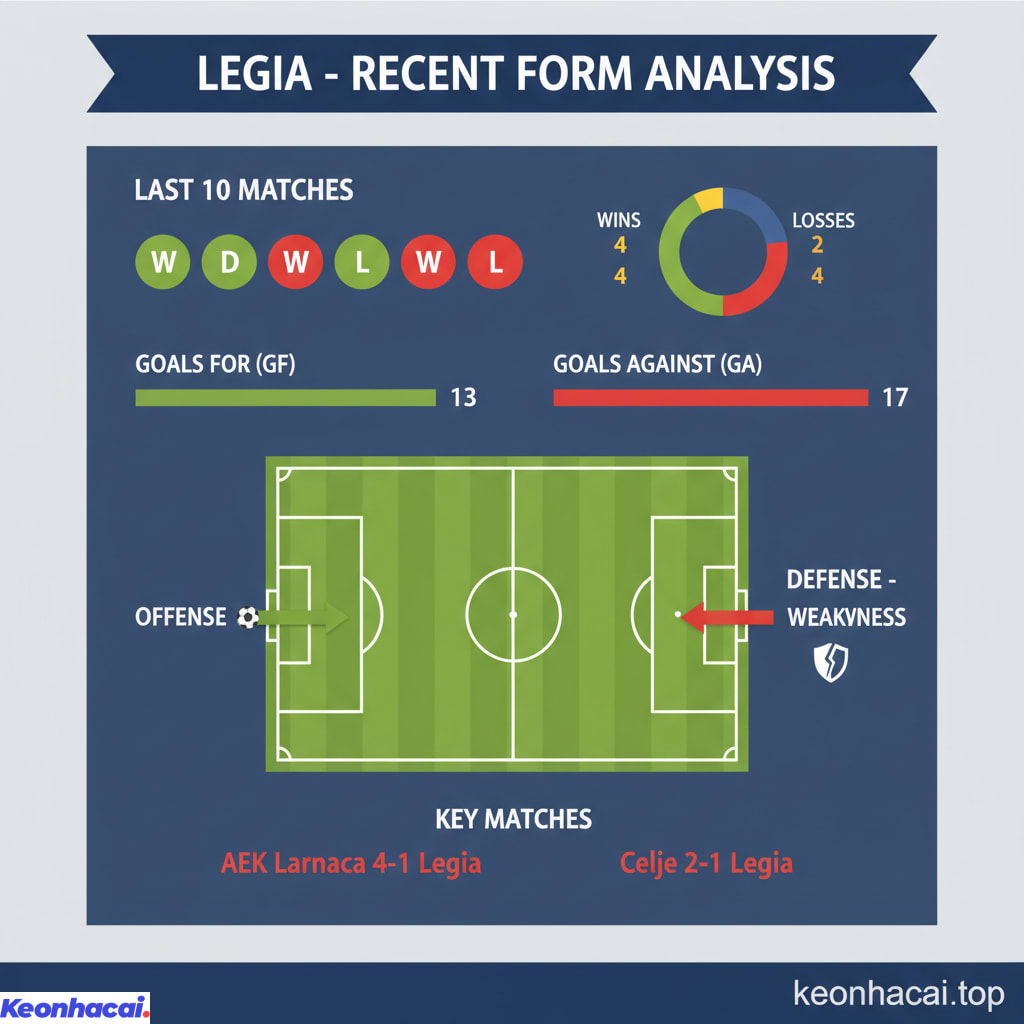 Với 4 chiến thắng, 2 trận hòa và 4 trận thua trong 10 trận gần nhất, Legia đang trải qua giai đoạn khó khăn hơn FC Noah một chút. Hàng công của Legia vẫn có thể tạo ra đột biến, nhưng hàng thủ lại là điểm yếu dễ bị khai thác, đặc biệt là trong các trận đấu sân khách như thất bại 4-1 trước AEK Larnaca hay 2-1 trước Celje. Lối chơi của Legia thiếu đi sự chắc chắn và khó lường, khiến họ dễ bị đối thủ bắt bài. Phong độ hiện tại của họ chưa thực sự đủ để tạo niềm tin lớn cho người hâm mộ. Để có cái nhìn đa chiều hơn về các trận đấu khác, đừng bỏ qua bài Soi kèo Breidablik vs Shamrock Rovers.