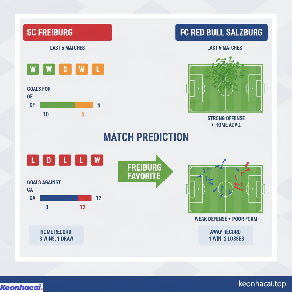 Tổng quan lại, Freiburg đang cho thấy một hình ảnh ổn định và mạnh mẽ hơn hẳn so với Salzburg. Đội bóng của Đức sở hữu hàng công hiệu quả và một hàng thủ chơi chắc chắn hơn, dù vẫn còn những sai sót nhất định. Họ có lợi thế sân nhà và đang có tinh thần tốt sau những kết quả tích cực gần đây ở cả Bundesliga lẫn Europa League.