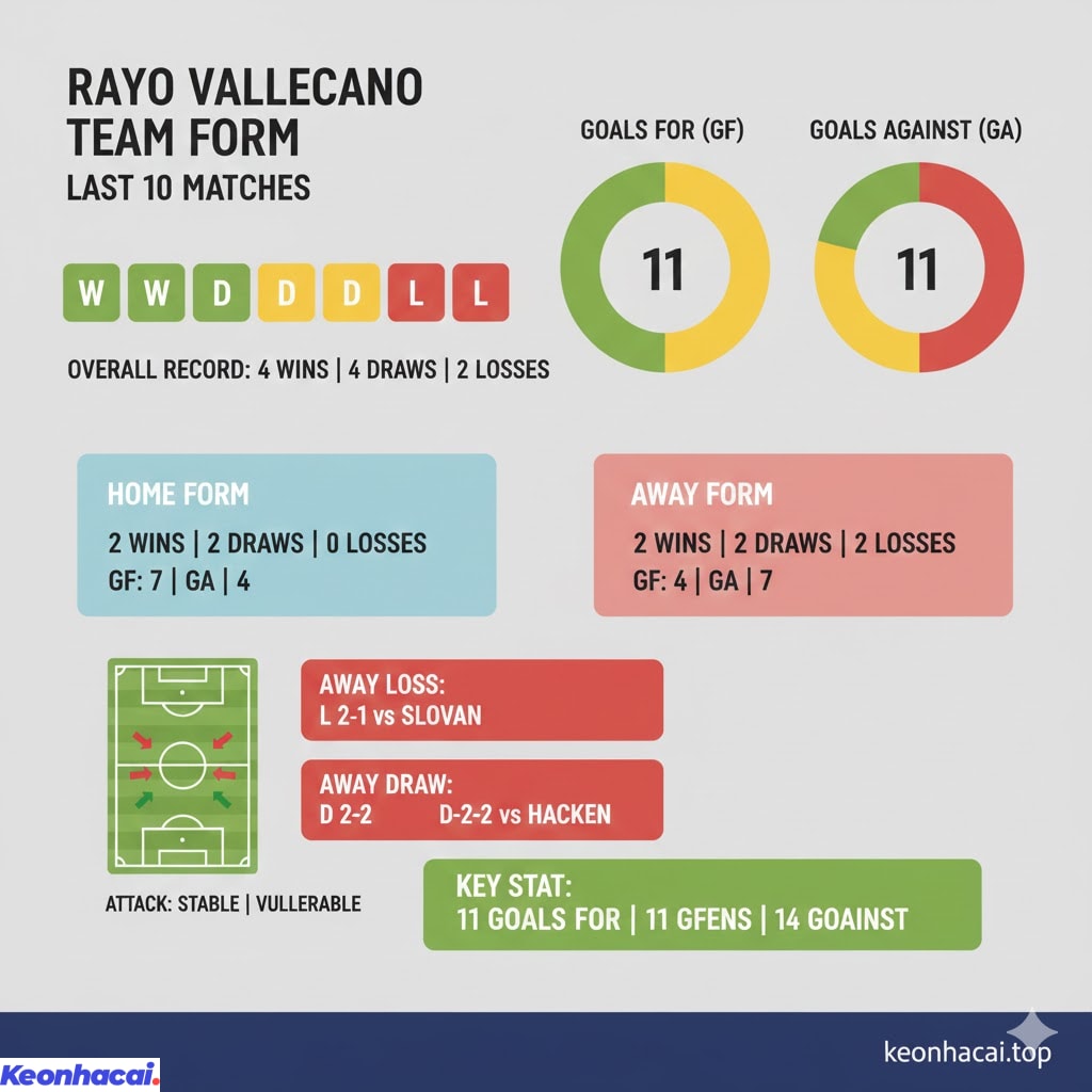 Trong 10 trận gần nhất, Rayo Vallecano có 4 chiến thắng, 4 trận hòa và 2 thất bại. Đáng chú ý, các trận thua của họ thường đến từ những đối thủ mạnh tại La Liga hoặc trên sân khách ở châu Âu. Khả năng ghi bàn của Rayo Vallecano khá ổn định với 11 bàn, nhưng hàng thủ cũng để lọt lưới 11 bàn, cho thấy sự thiếu chắc chắn nhất định. Phong độ sân khách của họ cũng khá thất thường, điển hình là trận thua 2-1 trước Slovan và trận hòa 2-2 với Hacken ở Conference League.