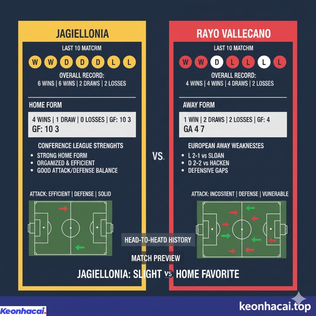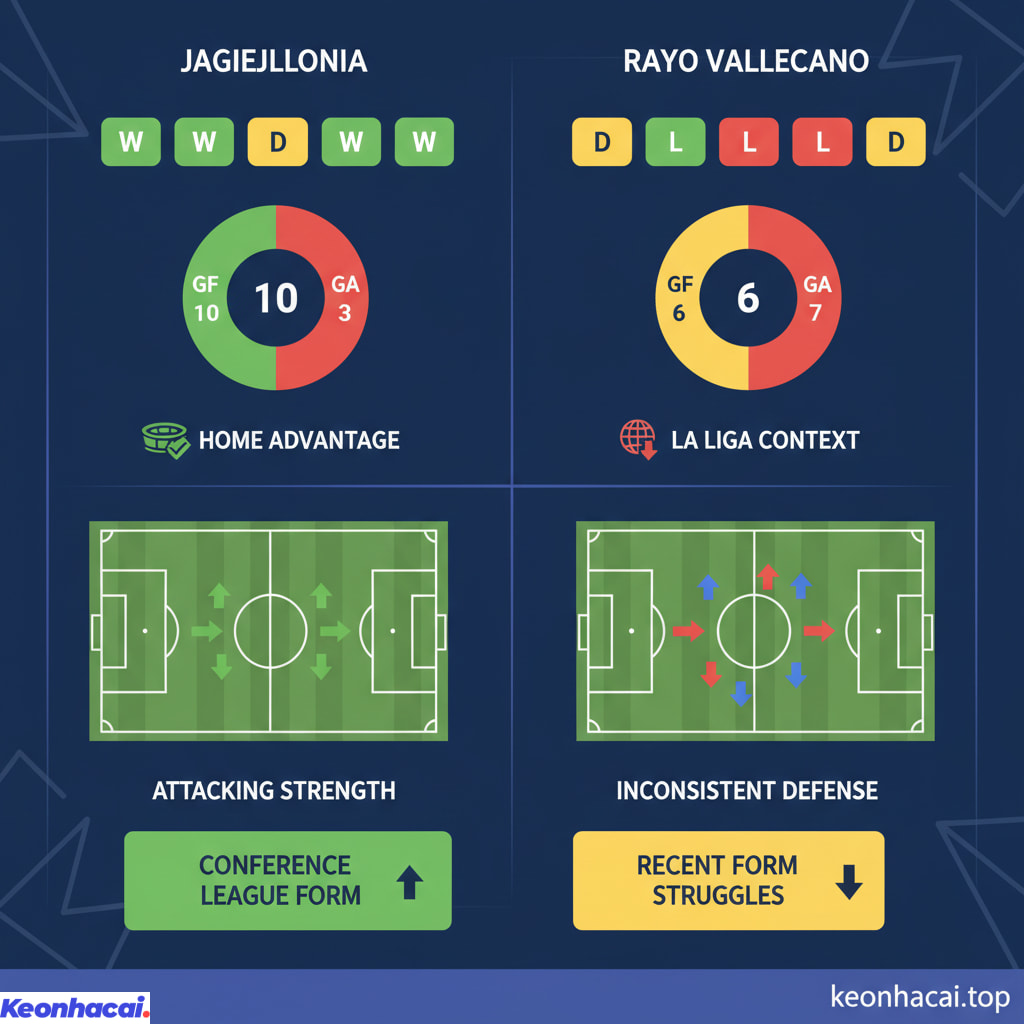 Vì không có dữ liệu đối đầu trực tiếp, việc phân tích sẽ dựa chủ yếu vào phong độ hiện tại, sức mạnh nội tại và bối cảnh của từng đội. Jagiellonia đang có phong độ rất cao tại Conference League và có lợi thế sân nhà, điều này có thể giúp họ tạo ra bất ngờ. Trong khi đó, Rayo Vallecano đến từ một giải đấu khắc nghiệt hơn là La Liga, nhưng phong độ gần đây lại không quá ổn định. Việc thiếu lịch sử đối đầu cũng khiến trận đấu này trở nên khó đoán hơn, khi cả hai đội đều phải thăm dò đối thủ từ đầu trận.